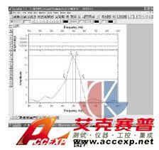 打開菜單欄Analysis下拉式菜單,選中FFT選項,對圖6所示的脈沖反射波形進行傅立葉變換。根據(jù)被測探頭的頻率標稱值,在頻譜圖橫坐標中選取相應的頻率范圍值(這一范圍值通常為0MHz到被測探頭頻率標稱值的2倍),這樣就得到了理想的脈沖反射頻譜圖。在脈沖反射頻譜圖上,把脈沖反射響應曲線上的頻率峰值點下降6dB處(頻率響應曲線的峰值點下降一半處)的fL和fH值定義為帶寬的低值和高值,兩者之間的算術平均值即為被測探頭的回波頻率,見圖7。