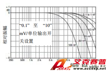 下圖顯示了輸入負荷電容對 Brüel & Kjær 電荷放大器高頻率響應的影響。