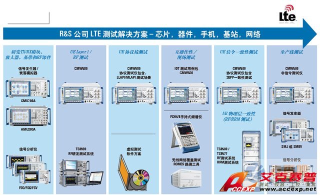 四、終端整機測試:針對LTE終端的射頻測試,R&S除了提供射頻儀器外,還提供終端射頻一致性測試系統(tǒng)TS8980FTA。TS8980FTA是GCF認可的全認證測試平臺,可以對終端進行GCF要求的全認證測試,而TS8980S則用于研發(fā)和預認證階段;針對LTE終端的協(xié)議測試,R&S提供GCF認可的協(xié)議一致性測試儀CMW500;同時,R&S還提供對終端無線資源管理、互操作性、數(shù)據(jù)業(yè)務性能的測試解決方案;針對基站終端生產,R&S的CMW500是首臺支持LTE信令的無線綜測儀,獨具雙通道測試能力和各種創(chuàng)新的測試方法,可以快速測試LTE終端的射頻和信令,是LTE生產的首選。