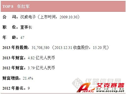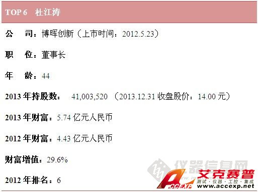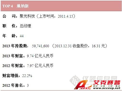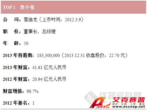 儀器儀表網(wǎng) http://www.mqmlro.cn了解到,由儀器信息網(wǎng)發(fā)布的“國內(nèi)上市儀器公司創(chuàng)始人2013財(cái)富榜”中,入榜的10位公司創(chuàng)始人財(cái)富在2013年均實(shí)現(xiàn)了不同程度的增長,其中增長幅度最大的當(dāng)屬雪迪龍董事長、總經(jīng)理敖小強(qiáng),其2013年所擁有的財(cái)富高達(dá)40億元人民幣,增幅近100%。獲益于中國在環(huán)保監(jiān)測領(lǐng)域的大投入,雪迪龍?jiān)?013年業(yè)績突出,雖然雪迪龍?jiān)?013年“10轉(zhuǎn)10”增發(fā),但其股價(jià)依然與2012年底基本持平。敖小強(qiáng)個(gè)人財(cái)富的激增主要得益于此。