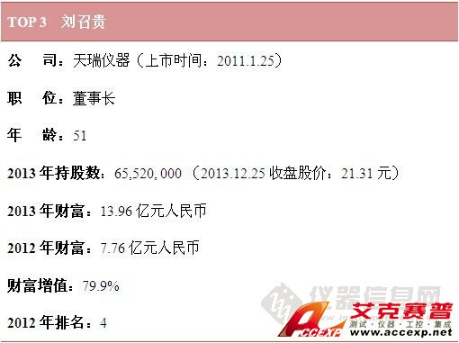 增幅排名第2的是天瑞儀器董事長劉召貴,其財(cái)富增長了約80%,2013年個(gè)人財(cái)富約14億元人民幣。2013年,天瑞儀器收購了環(huán)境監(jiān)測儀器企業(yè)宇星科技,之后股價(jià)呈現(xiàn)一路漲勢,借此劉召貴的財(cái)富實(shí)現(xiàn)大幅增長。