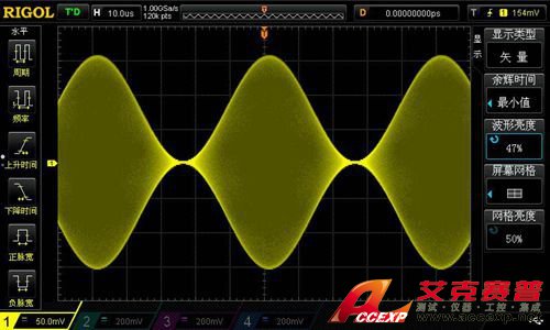 除此之外,DS1054Z還擁有完美的熒光顯示效果,不但清晰顯示各種調(diào)制信號,還可提供異常信號出現(xiàn)概率信息;它還標(biāo)配12M存儲深度,是同檔示波器中的最高水平,可以捕獲更長時間波形和更多信號細(xì)節(jié),添加選件還可擴展到24M。在測量功能方面,DS1054Z可以提供24種自動測量功能,可同時顯示5個測試參數(shù),并提供測試結(jié)果的統(tǒng)計分析;以及通過/失敗模板測試功能,可以長時間監(jiān)測和生產(chǎn)線測試應(yīng)用等。在添加選件后,DS1054Z還可提供6萬幀的硬件波形錄制與回放功能和串行總線觸發(fā)與解碼功能,可支持I2C、SPI、RS232/UART總線的觸發(fā)和解碼。