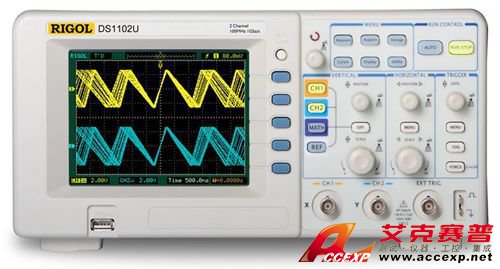 RIGOL推出的另一款電商專賣產(chǎn)品是價格1580元,具有100MHz帶寬,1Gs/s采樣率的雙通道經(jīng)典款DS1102U數(shù)字示波器。這款產(chǎn)品除了具有性價比優(yōu)勢外,還具有各種實用功能:它具有獨特的交替觸發(fā)功能,可以將兩路不同頻率信號穩(wěn)定顯示分析;還具有軟件實現(xiàn)的波形錄制功能(記錄多達(dá)1000幀波形)、標(biāo)配通過/失敗測試功能、觸發(fā)電路靈敏度可調(diào)功能等。為了方便操作,它具有在線聯(lián)機幫助功能,不熟悉的人也可以輕松學(xué)會所有操作。