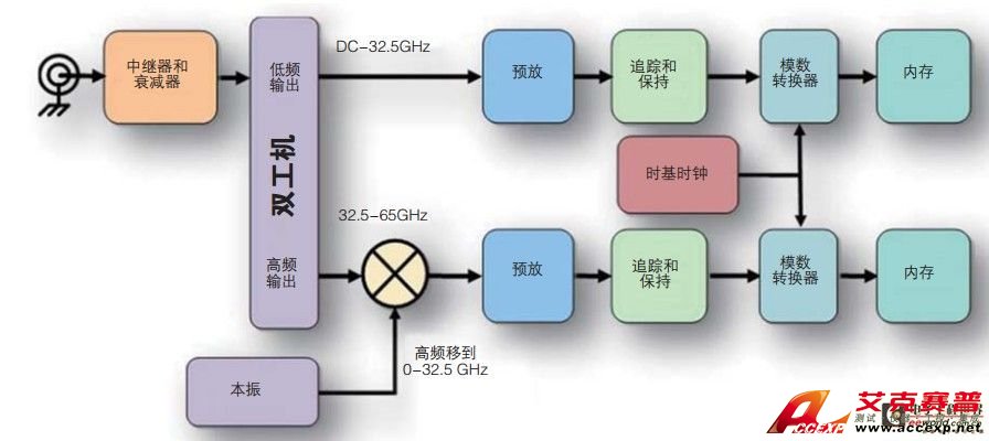 Martin詳細描述了之前的一些技術方案:“為了拓展帶寬,時間隔行掃描是一種常用技術。隨著采樣率的提高,隨機噪聲會均勻分布到新的內奎斯特帶寬上。泰克的競爭對手在高帶寬示波器上采用數字帶寬隔行掃描,對于示波器設計人員來說,其主要優勢是每臺ADC的采樣率只需大于總帶寬。但是這種設計面臨許多挑戰。一旦采集結束,數據放入波形內存,那么必須使用DSP把上方頻段上變頻回到原始頻率范圍?;謴蛢蓚€‘一半’頻譜、重建波形非常復雜。由于路徑并不是完全一樣,因此必須在抵消中補償這些差異,抵消則是DSP的一部分。此外,由于兩個‘一半’頻譜中使用急劇的帶通濾波器,因此恢復頻譜的具體中心存在問題。在重復區域可能有平坦度問題,在該點上相位線性度也有問題。噪聲PSD會均勻分布在采樣通道的內奎斯特帶寬上。事實上,使用頻率交織時,噪聲會提高,而且沒有在保持帶寬不變的情況下去降低噪聲的機會。”