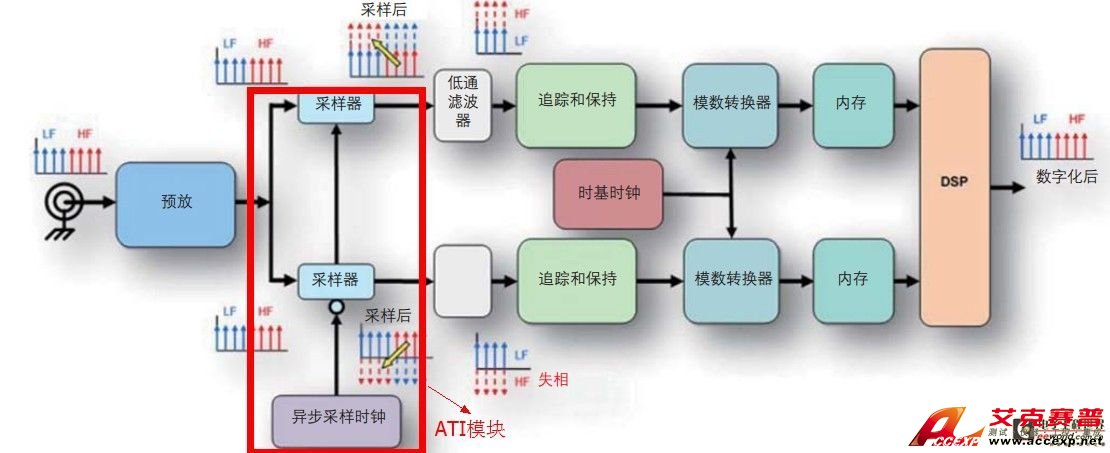 ATI中完全對稱的路徑實現理想的性能匹配;每條路徑數字化整個信號,而不只是一半;重建增加了兩份整個信號,可以除以2進行平均,使噪聲下降3dB。Martin對ATI的原理進行了細致的解釋:“在異步時序交織(ATI)技術中,預采樣器作為諧波混頻器??驁D如下圖所示。需要說明的是:路徑是對稱的,ATI中使用兩個ADC采樣整個頻譜,信號的整個帶寬都被應用到兩個ADC,這樣,噪聲的功率譜密度均勻分布到總采樣率中(每個ADC采樣率的2倍),結果,通帶中的整體噪聲要低于類似頻率交織結構中的噪聲。這種設計采用預采樣器,故意對輸入信號進行次采樣,從而產生假信號,或把頻譜成分的上半部分翻回到ADC的內奎斯特帶寬。在最后組合步驟中,本質上是和除以2,這一函數把輸入幅度返回原始值,另外會影響整個采集的噪聲平均,從而進一步降低測量通道的總噪聲。”