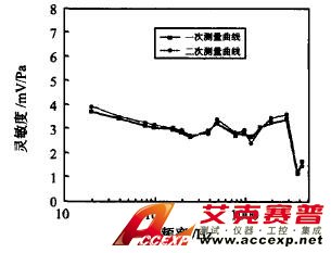 為檢測測量系統(tǒng)的重復(fù)性,實(shí)驗(yàn)對1#傳感器進(jìn)行了重復(fù)測量,圖3示出2次測量的靈敏度變化曲線。