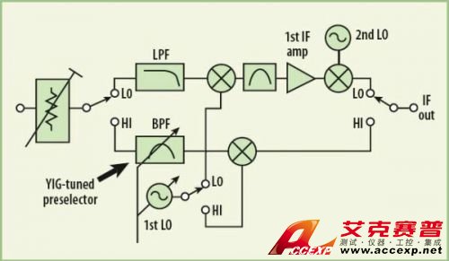 工作在26.5GHz的現代頻譜分析儀具有一個"低頻帶"和一個"高頻帶"信道,如圖1所示。低頻帶通常可工作在3GHz或更高頻率。在低頻帶上,信號上變頻到接近4GHz或更高的高IF頻段,然后再下變頻到接近300MHz的較低IF頻段。這種雙變頻方式可以極大地減少混頻器鏡像響應。