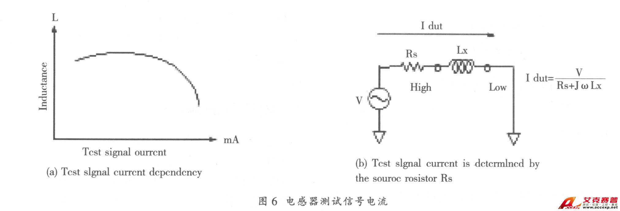 磁性電感器與測試信號電流的關系如圖6 (a)所示。電感量隨測量電流的大小而不同, 即使將兩臺不同的儀器設置為同樣的輸出電壓, 如果它們的源阻抗不同, 它們的輸出電流也將不同, 請參考圖6 (b)。有些磁性電感器的電感量與流過電流的關系很大, 電流的變化可導致電感值成倍地變化。我們多次遇到元件制造廠與元件使用廠家的糾紛就源于此。他們用不同的儀器測量同一產品的結果有很大的不同, 進而懷疑儀器有問題, 但儀器經過我們計量校準是合格的。其實就是因為儀器的源阻抗不同而導致通過測試件的電流不同, 測量結果當然也就不一致。因此一些高檔的LCR 表有電壓、電流監視器功能, 可監測實際加在測試件上的電壓及流過測試件的電流。