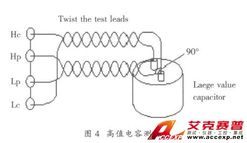 在電容器的測量中, 應注意的事項與被測電容量有關, 高值電容測量屬于低阻抗測量, 因此必須把接觸電極、測試夾具和電纜中的接觸電阻及殘余阻抗減到最低, 應使用4 端、5 端或4 端對配置把DUT 接到儀器上。在使用4 端和5 端配置時, 必須確保高測試信號電流流過電纜, 為避免電磁場耦合的影響, 按圖4 所示的方式來連接電纜;此外, 為進行精確測量, 應正確使用開路、短路補償。特別是對于施加直流偏置電壓的電解電容器,應在直流偏置設置為ON (0 V) 時進行開路/短路補償。