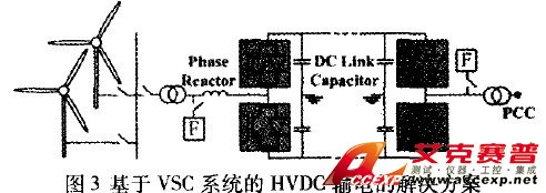 基于電壓源變流器(VSC)的HVAC輸電系統(tǒng)越來越受到廣泛的關(guān)注,不僅僅足跟電網(wǎng)相連的大型離岸風(fēng)電場的關(guān)系。現(xiàn)在基于VSC的解決方案已經(jīng)被ABB公司推向市場,并且命為“HVAC light”,Simens公司命名為“HVAC Plus”。圖3給出了基VSC的HVD輸電系統(tǒng)的原理圖。這種相對較新的技術(shù)(在1999年被商業(yè)化安裝運(yùn)行)只有在能自關(guān)斷電流的IGBT器件發(fā)展下才可能實(shí)現(xiàn)。這意味著已不需要一個(gè)有源換流電壓了。因此,基于VSC的HVDC輸電系統(tǒng)就不再需要很強(qiáng)的離岸和岸上的交流電網(wǎng),甚至能在完全癱瘓的電網(wǎng)中啟動(dòng)(黑暗啟動(dòng)能力)。但是,這種系統(tǒng)還有其他一些優(yōu)點(diǎn):無功和有功可以分別獨(dú)立控制,這樣就可以減少對無功功率補(bǔ)償?shù)男枰⑶夷芴岣呓涣麟娋W(wǎng)在它們連接點(diǎn)的穩(wěn)定性。