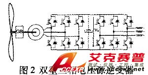 1)利用雙反饋感應(yīng)發(fā)電機(jī)(DFIG)的變速技術(shù):這種強(qiáng)迫開關(guān)的功率變流器的原理圖如圖1所示。變流器包括兩個(gè)三相AC—DC功率變流器,兩者由一個(gè)直流電容器電池鏈接。這種結(jié)構(gòu)一方面保證對機(jī)器的有功功率和無功功率進(jìn)行矢量控制,另一方面還能減少功率變流器注入電網(wǎng)的諧波大小。