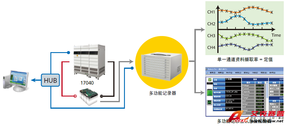 17040系統透過軟體可整合多功能記錄器,在充放電過程中,讀取多組的電壓與溫度紀錄,其條件可轉成保護啟動條件或截止條件。多功能記錄器可達到各通道同步取樣,最快的資料擷取速度為10ms,17040系統則最多可支援多功能記錄器達120通道。