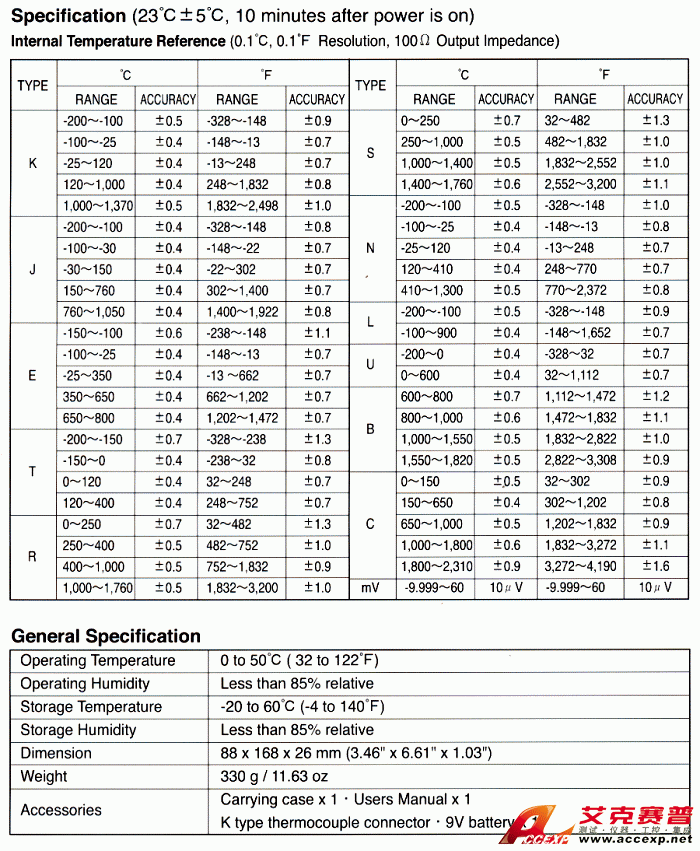 可校正11種溫度探棒(K.J.E.T.R.S.N.L.U.B.C type)