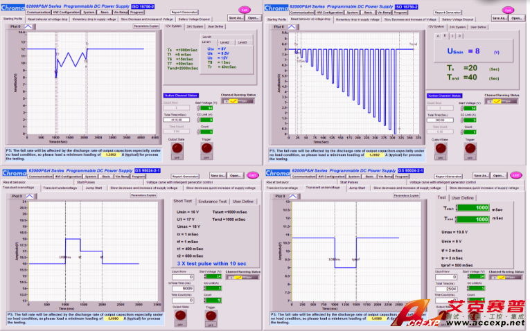 Chroma最新推出汽車環境電力負載試驗軟件,此SoftPanel軟件已內建ISO 16750-2、GS 95024-2-1及VW 80000標準于62000P&H系列直流電源產品,可簡易聯機控制直流電源供應器提供圖形化測試曲線進行測試,此非常適合研發及品保單位對 LED頭燈、ECU、雨刷馬達、電動車窗、車用音響、GPS、充電器..等車用電子產品做長時間性能及穩定性驗證。汽車零組件電力負載測試軟件將依照 ISO 16750-2、GS 95024-2-1及VW 80000規范,