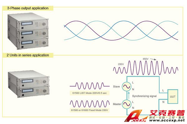 Model 61501/61502/61503/61504/61505可以使用三臺, 在三相模式的同步機制下, 串聯成三相電輸出使用. 或使用兩臺做高壓(300V-600V)輸出應用, 搭配LIST模式可進行瞬間高壓450V/0.5秒的測試, 如圖.