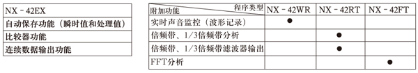 使用一些選項使儀表附加上如下功能:同時記錄原始[未處理]數(shù)據(jù)(100ms Lp)和處理過數(shù)據(jù)(Leq和其它指數(shù)),頻率分析和長期數(shù)據(jù)記錄。 當安裝上NX–42EX時,能添加上NX–42WR、NX–42RT和NX–42FT。 NX–42EX程序安裝后不能.卸載。