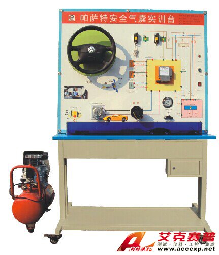 安全氣囊電控單元、安全氣囊總成、方向盤、碰撞傳感器、彈性線束、空氣泵總成、檢測端子、故障設置系統、大容量蓄電池或12V開關電源、大型彩色噴繪電路原理圖、控制面板、可移動臺架、使用說明書及任務驅動式實訓指導書等。