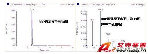在本次塑化劑檢測中,通過此檢測方法,既可以得到塑化劑的兩對MRM 以及比值,還能夠得到EPI圖進行定性確證和庫檢索。