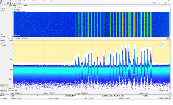 播放記錄的信號可以把觀察等待頻譜違規的時間從幾小時縮短到幾分鐘,您可以在桌面上復核記錄的數據。記錄長度只受存儲介質容量限制,記錄是SignalVu-PC中標配的基本功能。SignalVu-PC應用SV56播放可以全面分析所有SignalVu-PC 測量數據,包括DPX三維頻譜圖。在播放過程中保持最短信號時長指標。可以執行AM/FM音調解調。提供了可變頻寬、解析帶寬、分析長度和帶寬。可以在記錄的信號上執行頻率模板測試,支持最高40 MHz頻寬,模板違規操作包括蜂鳴、停止操作、保存軌跡、保存圖像、保存數據。可以選擇并循環播放的各個部分,重復考察關心的信號。播放可以是無隙的,也可以插入時隙,縮短復核時間。實時速率播放保證了AM/FM解調的保真度,提供了與實際時間1:1播放。記錄的時鐘時間在三維頻譜圖標記中顯示,與真實世界事件相關。在下圖中,正在重播FM頻段,使用一個模板檢測頻譜違規,同時偵聽92.3?MHz中心頻率的FM信號。