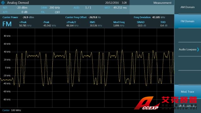 基本數字調制格式被用于多種應用,例如近場通信。R&S FPC 支持 ASK 和 FSK 分析。數字調制顯示屏包括軌跡、眼圖、調制誤差和符號分析。此外,還提供低功耗藍牙 (Bluetooth LE) 和胎壓監測系統 (TPMS) 的專有配置預設。通過內置揚聲器或耳機插孔支持解調音頻。