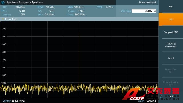 R&S FPC1500 可以在獨立模式下使用集成式信號源。由于具備這種獨特功能,R&S FPC1500 可用作連續波 (CW) 信號發生器。信號源可用作本振信號以進行混頻器測量,或用作輸入信號以進行放大器增益測量。