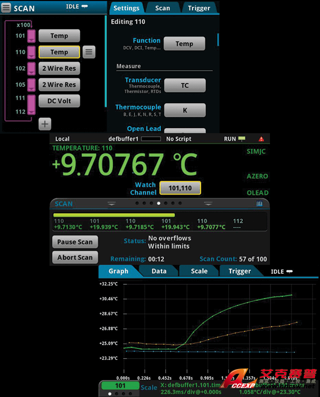 設(shè)置和運行測試簡單快速,無需編寫測試程序。 DAQ6510 數(shù)據(jù)采集和記錄萬用表系統(tǒng)的直觀觸摸屏能夠提供簡單的配置,以及可視的直觀測試設(shè)置、實時的掃描狀態(tài)可視信息,可盡早捕捉問題以避免丟失測試時間,便于分析測試數(shù)據(jù)。