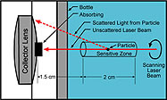 采用"近前向光散射"原理,旋轉激光束通過流通池的玻璃器壁,當光束通過中心"感測區"時,PC-2200同時測出懸浮顆粒的的數量和粒徑大小.光脈沖產生的模擬信號輸入計算機并進行數字化.