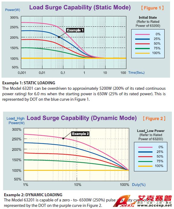 依據63200系列電子負載的初始負載情況,會有不同的浪涌 負載能力,如圖1與圖2的關系圖所示,圖中顯示的是初始負 載與可過載的最大負載能力與時間關系。當使用浪涌負載功 能時,如果超出圖1及圖2中所顯示的最大浪涌負載能力時, 電子負載會顯示過功率保護(OPP),并停止拉載。