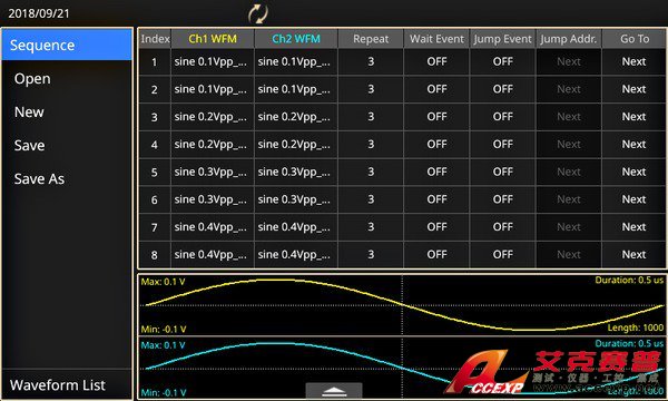 高級模式是 AFG31000 中提供的新模式,可以生成多個復雜定時的波形。在這種模式下,您可以編寫一個由 1~256 個波形組成的列表(或序列),總波形長度可達 16Mpts/ch (128Mpts/ch 選配),并定義這些波形的輸出序列。支持重復、轉到、等待、跳轉和已觸發事件,大容量內存可以存儲許多波形或長波形。